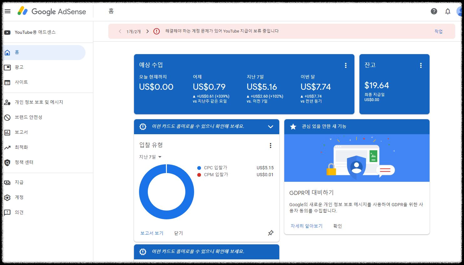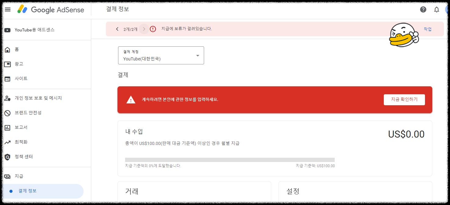 구글 애드센스 승인을 받아서 수익이 아주 민망하게 조금씩 나던 중, 어느 날 애드센스 계정에 아래와 같은 메시지가 떴습니다. <해결해야 하는 계정 문제가 있어 YouTube 지급이 보류 중입니다. >, <지급에 보류가 걸려 있습니다.>