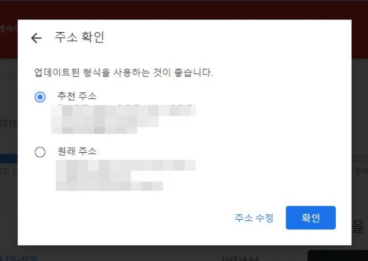 그러자 아래처럼 추천 주소가 뜨네요. 원래 제가 넣었던 주소보다 정확한 주소를 알려줍니다. 추천 주소에 체크되어 있는 상태로 확인을 누르니 핸드폰으로 인증번호가 옵니다.