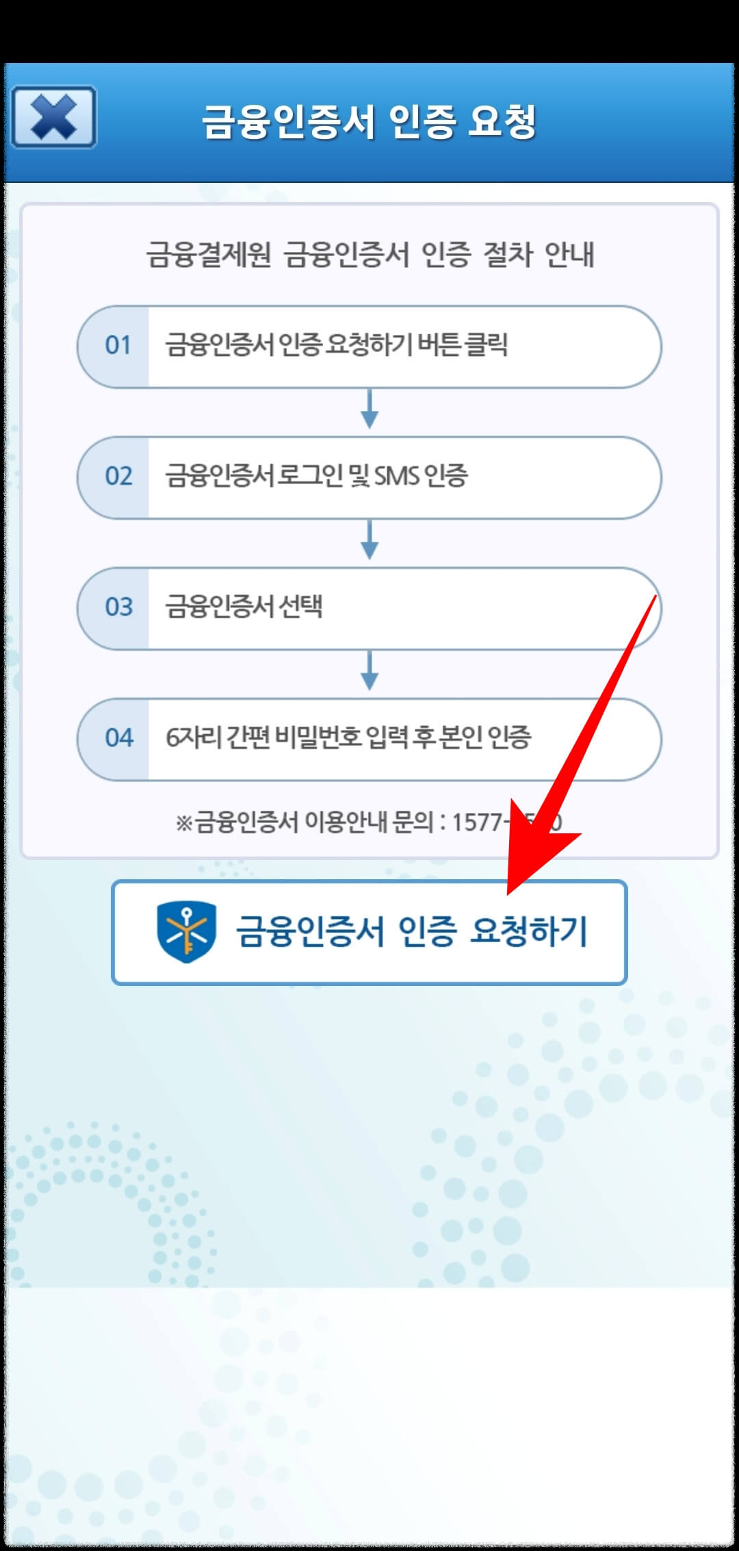 5. 금융인증서로 인증받아보겠습니다. 인적사항 적고, 휴대폰 문자인증을 합니다. 등록된 인증서를 터치합니다.