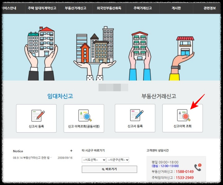 시도를 선택해서 매수한 부동산의 시도와 시군구를 선택한 후(매수한 부동산의 주소), 신고하기를 클릭합니다.