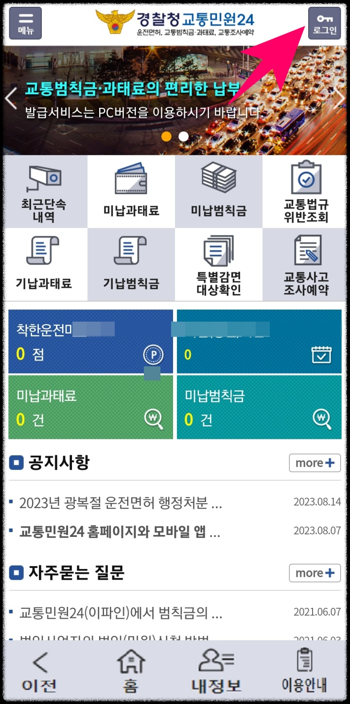 2. '교통민원24'를 열고 오른쪽 상단 로그인을 터치합니다. 그리고 인적사항을 넣고 간편인증을 합니다. 저는 카카오인증이 편해서 카카오인증을 했어요.